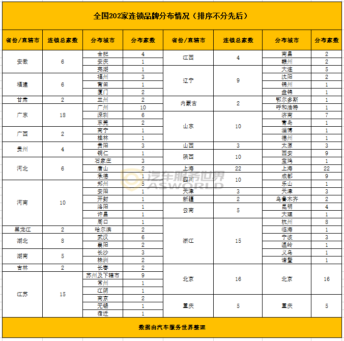 根据汽车服务世界的统计,截止到2021年,连锁品牌布局密度前三名的分别是上海(22家)、广东(19家)、北京第三(16家),除了这些省份/直辖市之外,河南、四川、湖北也是连锁品牌比较集中布局的4个省份,各自所拥有的连锁品牌分别为10家和8家。