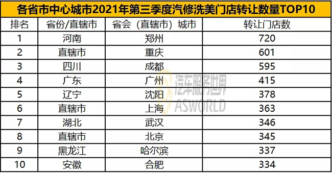 具体来看,2021年第一季度,内地31个省市自治区中心城市的汽服门店转让数量为5002家;