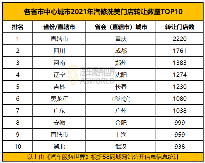 另一方面,汽车服务世界根据58同城“生意转让”一栏统计,2021年内地31个省市自治区中心城市的汽服门店转让数量为23156家,夫妻店成为转让的主体,可谓竞争惨烈。