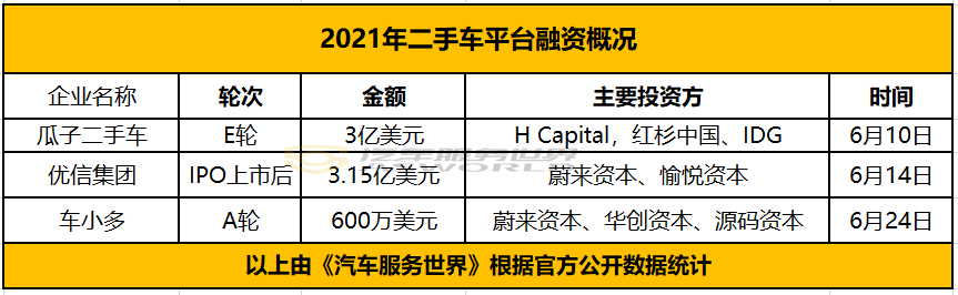 二手车电商平台的融资事件,集中发生在2021年上半年,融资方包括瓜子二手车、优信、车小多等平台型企业,共计融资近7亿美元。
