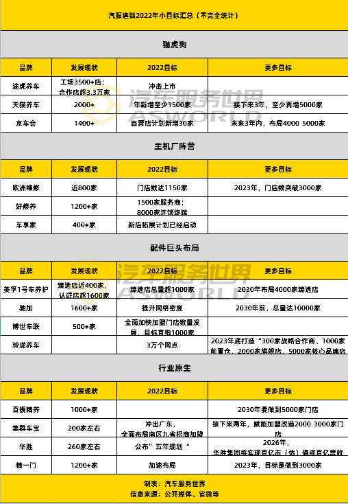 有这样小目标的不止猫虎。想“3年内布局4000-5000家”的京车会、“两年赋能2000-3000家”的集群车宝,“2023年突破3000家”的欧洲维修……这些品牌在2022年就宣布了这样紧促的渠道扩张规划,明显都抱了“年开1000家”的心思。