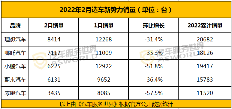 NO.8 新能源车企2月销量榜:环比均大幅下滑,最高下滑57.5%