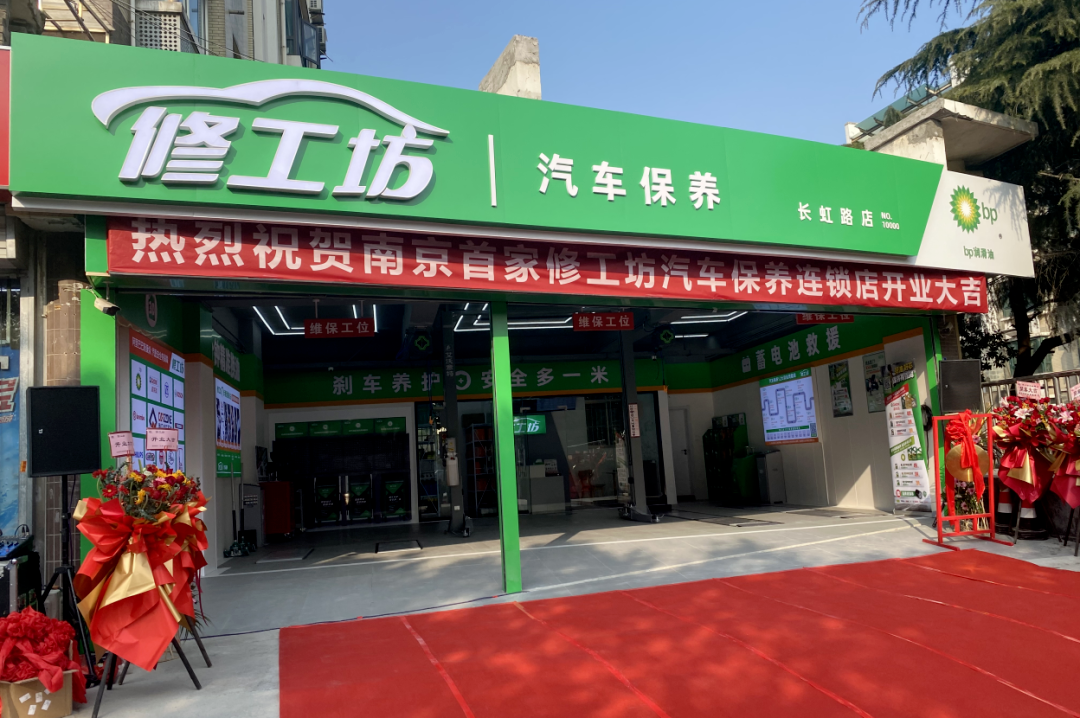 汽车服务世界观察到,首家修工坊门店面积在100平米左右,门头除了品牌logo,最醒目的是“汽车保养”四个大字,右侧还有一个“bp润滑油”的logo。