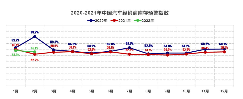 2月28日,中国汽车流通协会发布的最新一期“中国汽车经销商库存预警指数调查”显示,2022年2月中国汽车经销商库存预警指数为56.1%,同比上升3.9%,环比下降2.2%,库存预警指数位于荣枯线之上。