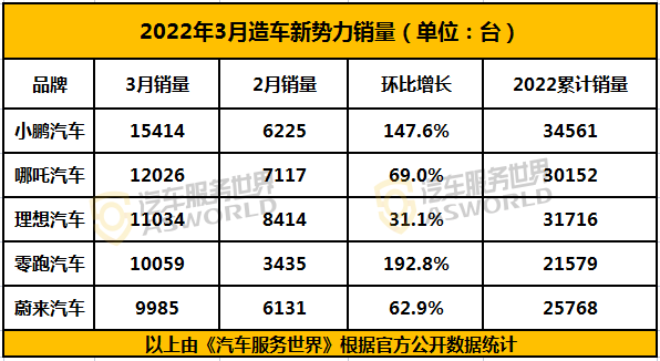 3月,各大新势力品牌交付量环比大幅回升,排名前五仍为“蔚小理”、哪吒、零跑,其中小鹏以15414的销量从上个月的第三跃居榜首,不仅环比增长接近150%,2022年一季度销量也遥遥领先。