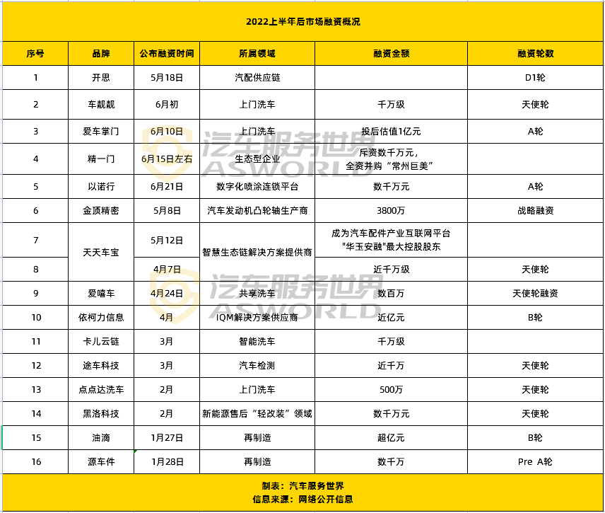据《汽车服务世界》不完全统计,不包含租赁、新出行等领域在内,上半年后市场一共发生了16起融资事件。
