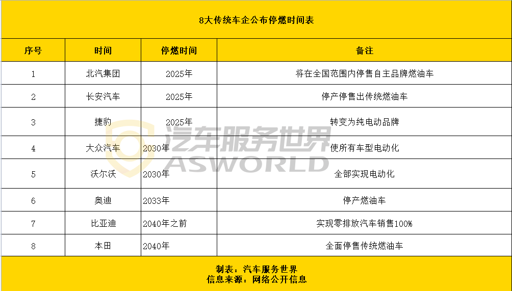 压力给到了车企端。在政策和民意的推动下,目前包含大众、本田、奥迪以及北汽、长安、比亚迪等八大国内外影响力车企,均公布了停售燃油车的时间表。