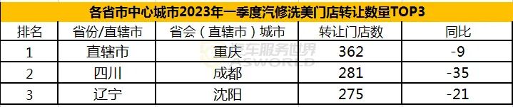 2023年第一季度门店转让数量TOP 3榜单,分别是重庆、成都、沈阳,仅有重庆一城门店转让数量超过300,达到362家,成都和沈阳分别为281家、275家。