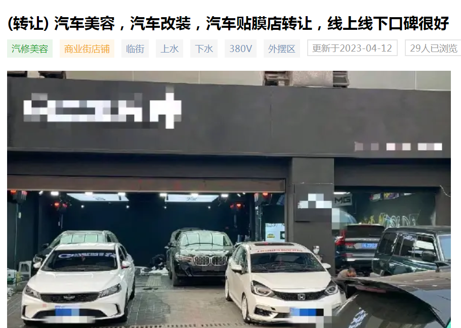 另一家位于重庆九龙坡区云湖路的汽车美容店,老板在58同城上发布了一条转让信息,标题为“转让十年老店汽修美容改色贴膜”。