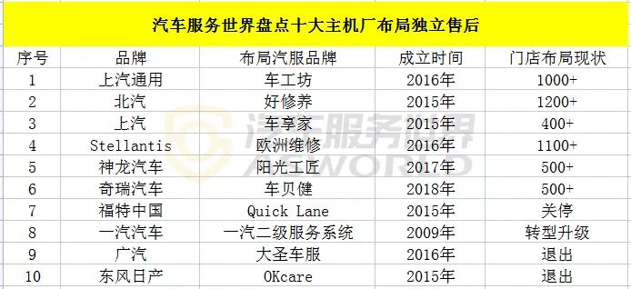汽车服务世界盘点了十大主机厂在汽后连锁的布局现状如下: