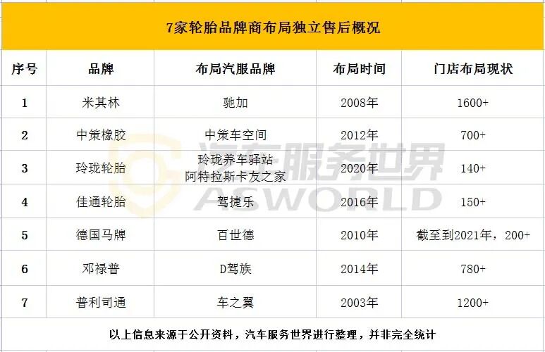 据汽车服务世界不完全统计,以米其林为代表的7家轮胎品牌,陆续在后市场领域布局汽服连锁,发展至今门店数量合计已经超过4500家,这些连锁的发展现状怎么样了?