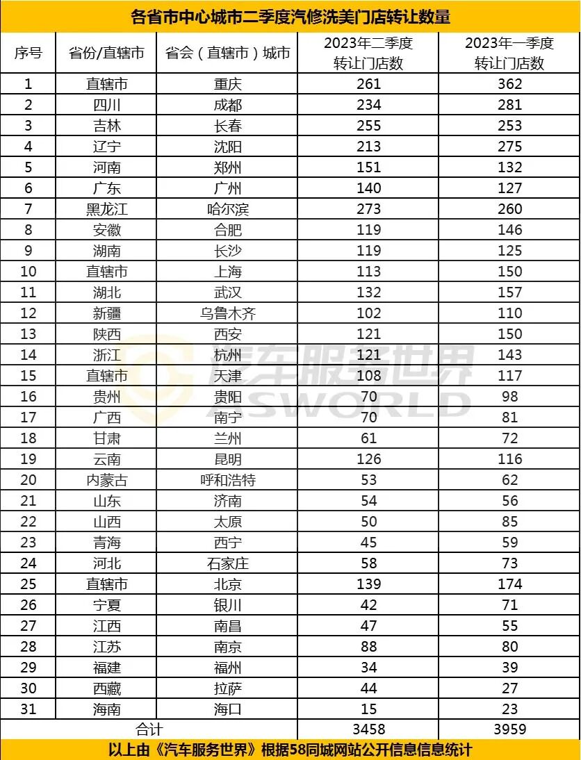 汽车服务世界根据58同城“生意转让”一栏统计,从4月1日到6月25日,内地31个省市自治区中心城市的汽服门店转让数量为3458家。