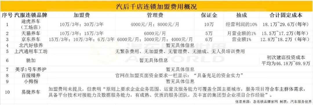 汽车服务世界通过上述10家千店连锁的官网加盟信息,梳理了各家对加盟连锁在加盟相关的固定支出费用。