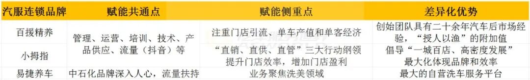 具备较强的品牌影响力是这三家互联网连锁养车平台的共通点。此外,在供应链产品、数字化系统、门店运营及管理、客户引流、培训提升等方面,三家平台都能对加盟门店进行赋能。