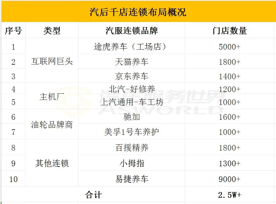 综上,目前汽车后市场千店连锁品牌已有10家,总计门店数量达到2.5万家以上。