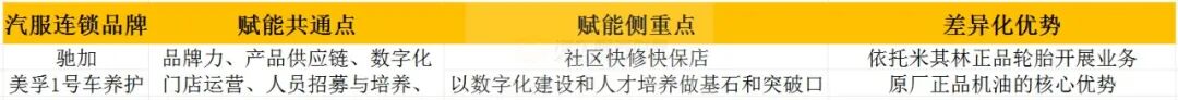 从产品角度来说,驰加的模式优势离不开米其林轮胎的超强品牌背书,轮胎作为与车主粘性较强的品类之一,米其林已经牢牢占据了用户心智;美孚1号车养护则依托美孚的品牌资源,有着原厂正品机油的保障,让加盟门店在建立用户信任与忠诚度中占据优势。