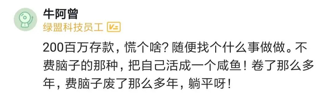 今天的话题是一个大龄程序员,拥有200万存款和一套房,感觉疲惫,想躺平也不敢,要不要辞职休息下,下面一起来交流下。