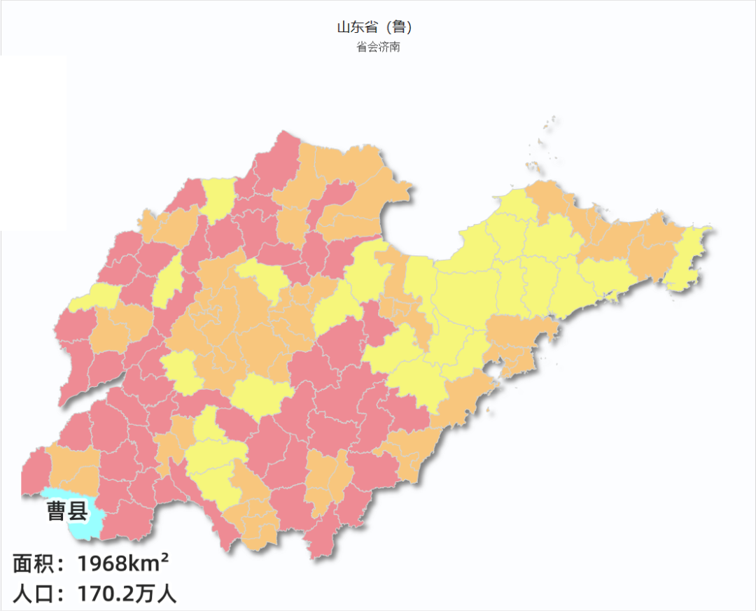 隶属于山东省菏泽市,古称曹州,位于山东省西南部,鲁豫两省交界处,总面积1969平方千米,辖5个街道办事处,22乡镇;根据第七次人口普查数据,截止到2022年,曹县户籍人口为170.2万人。