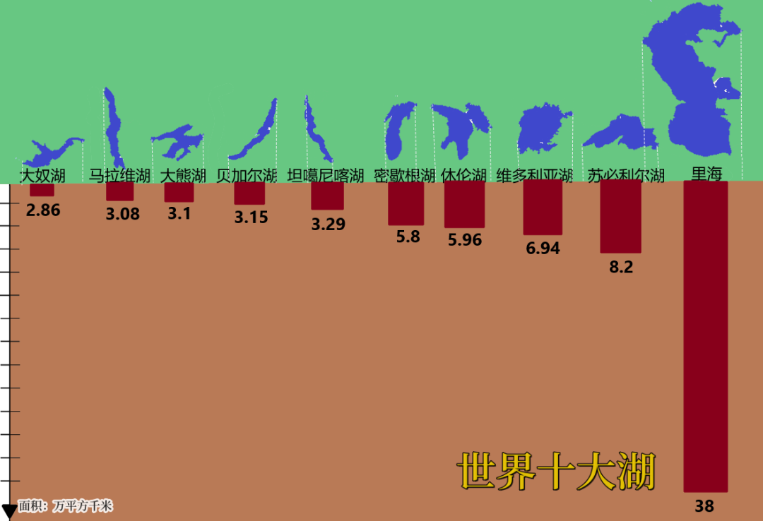 里海属于咸水湖,最大水深为1025米,蓄水量78200立方千米,大约是第二到第十大湖泊的蓄水量总和。