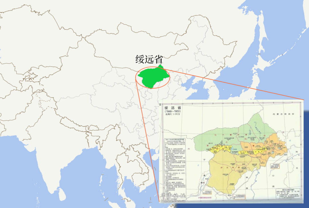 绥远正式成立于1928年,全省辖境相当于今内蒙古巴彦淖尔市、鄂尔多斯市、乌海市的海勃湾区,海南区、包头市、呼和浩特市及乌兰察布市大部,1947年底全省土地面积为32.93万平方千米。