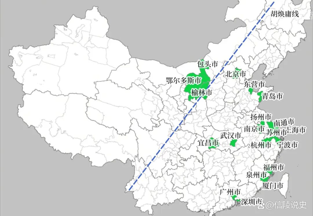 中国三大能源型城市:包头市(20344.28美元)、鄂尔多斯市(37923.20美元)及榆林市(26903.97美元)分布在胡焕庸线以西。其中,鄂尔多斯市人均GDP是中国大陆地区地级及以上城市中最高的。