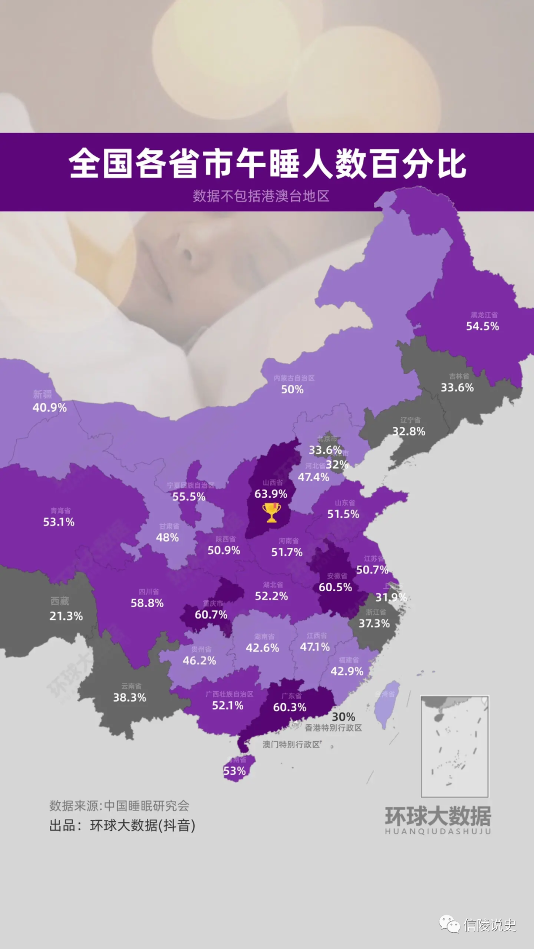 在这张睡眠地图中,山西以60%+的午休比例摘得桂冠,如此说来,山西人小时候都有被按在床上午休的经历吧。