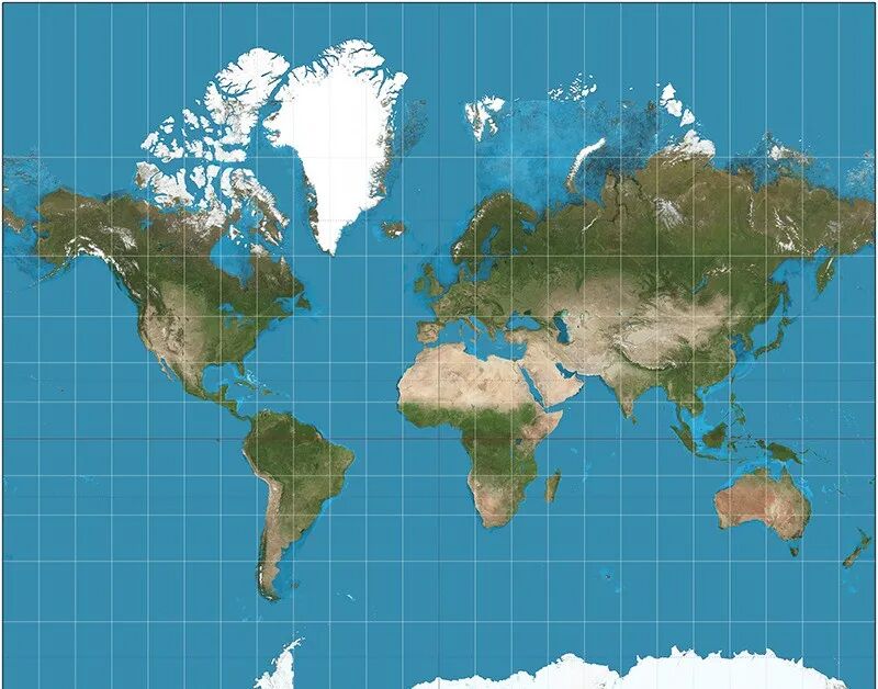 我们在翻阅世界地图的时候,有一个常见的现象,越靠近两极的地方,面积看起来越大,下面这张地图中,格陵兰岛看起来跟非洲差不多大了,但实际上格陵兰岛只有非洲的1/15左右。造成这种现象的原因是常见的地图用墨卡托投影绘制,原理我们不赘述,优点是可以保持正确的方向和角度,缺点就是地图畸变严重,越靠近两极越失真。