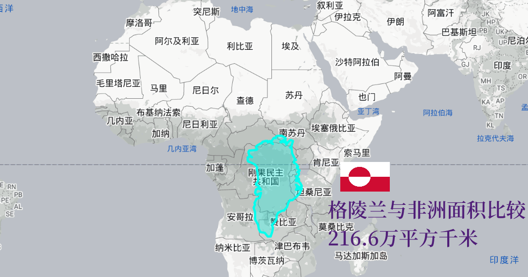 首先是上文提及的格陵兰,格陵兰面积216.6万平方千米,是世界上面积最大的岛屿,将格陵兰放在非洲,比刚果(金)略小,远没有墨卡托投影地图上的那么夸张。