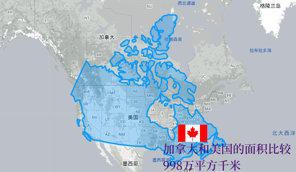 加拿大是世界上领土第二大的国家,有998万平方千米,由于大部分领土也是处于高纬度,所以也经常被放大,它和美国本土相比,能明显看出大了一些。