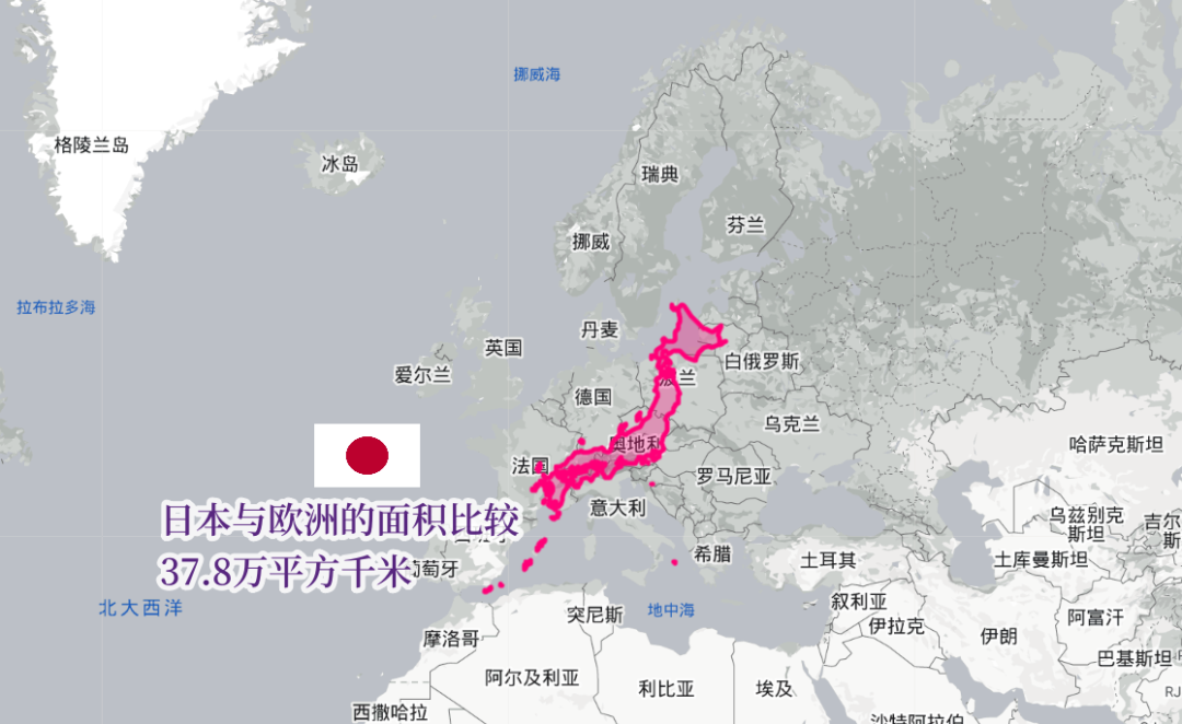 日本由于有我国和俄罗斯两个领土大国的“衬托”,所以显得比较小,但是如果将日本国土放在欧洲,我们会发现它与德国差不多大小,南北跨度大,从立陶宛可以延伸到摩洛哥。