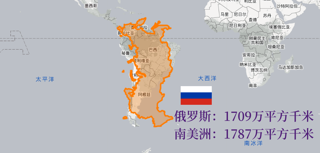 俄罗斯由于大部分国土位于高纬度,所以也经常被放大,在地图上看比非洲都大了,实际上俄罗斯只有非洲一半多一点,略小于南美洲。