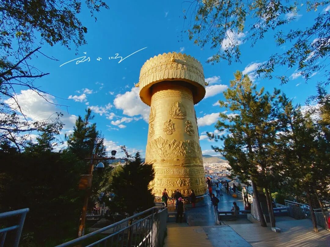 当然,“龟山公园”最具有标志性的景点还是这个“巨型转经筒”,据说它是全世界最大的转经筒之一,需要至少7个人合力才能转动,转一圈相当于念佛124万声,可以为家人朋友祈福消灾,游客也都要来转一转。