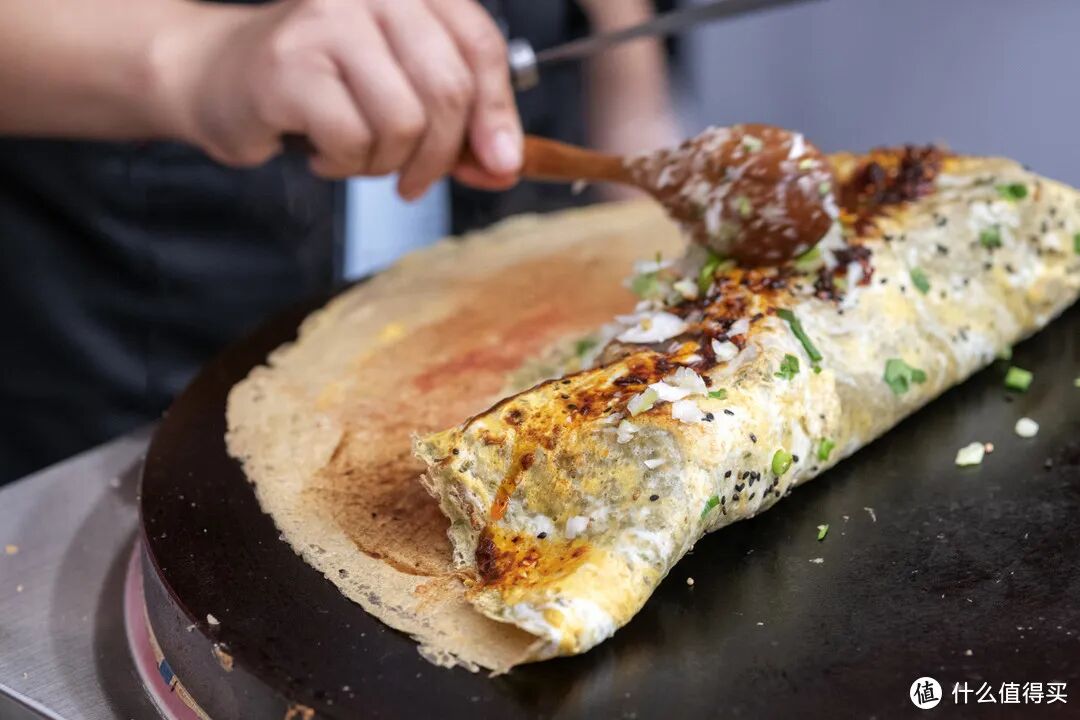 由绿豆面制成的糊,平平整整的摊在饼铛上,磕上鸡蛋,抹上甜咸交织的面酱,最后加一个酥脆的果篦儿,一套完整的煎饼果子就出炉了。
