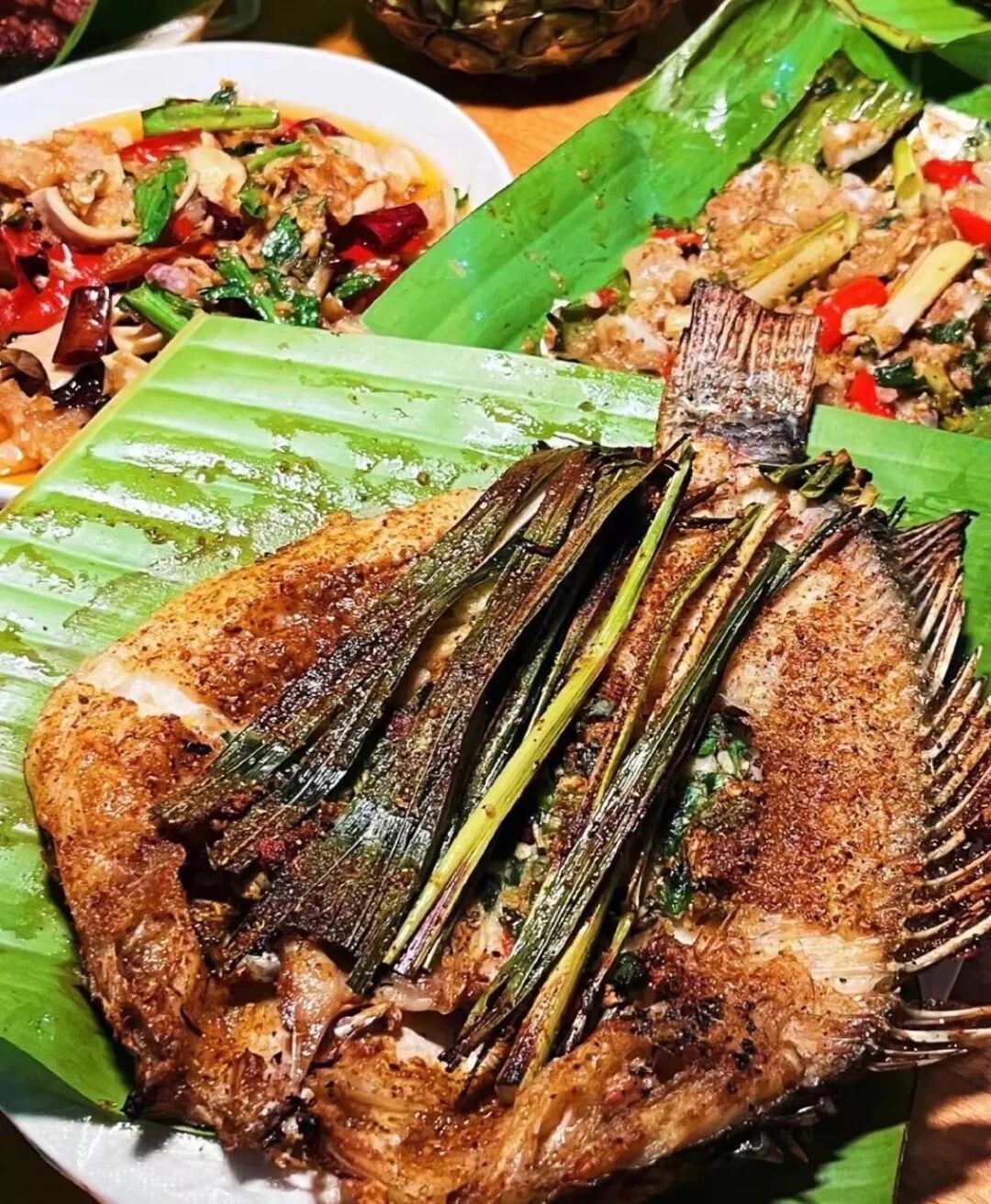 喜欢吃鱼的一定要尝一尝这边的香茅草烤鱼。这道菜主要有两个特点:一是用当地生长的青竹片夹住鱼,用明火烤,因此烤肉的香和青竹的香味交织在一起。二是这道菜用的是热带雨林盛产的香茅草和香菜,所以带着一股香茅奇特的香味。它最具特色的是鱼肚之内还有傣家的特殊酱料“番茄喃咪”。