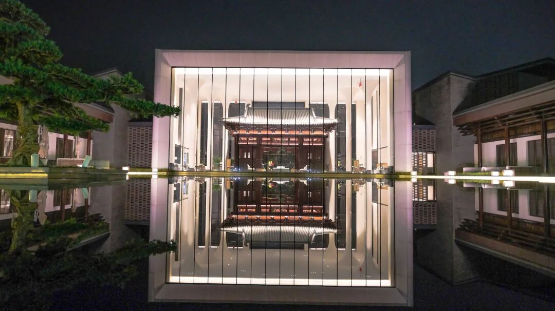 大堂中央的仿古建筑,据说是复刻了陆羽故居鸿渐楼。