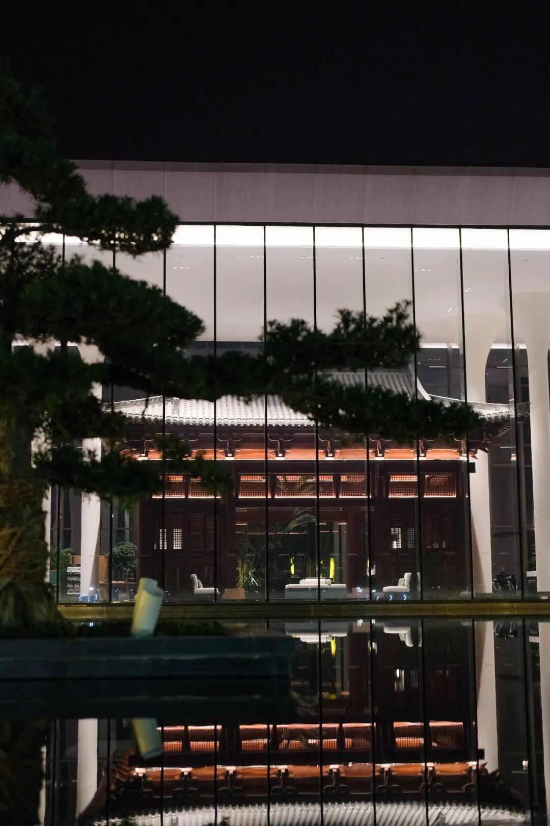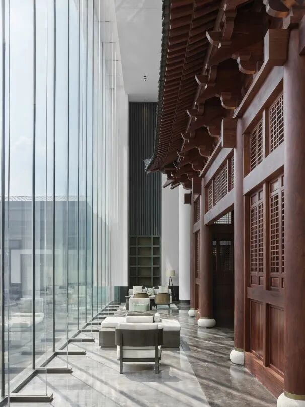 外观方正的建筑,其中有一整面墙由高度落差巨大的玻璃组成,仿佛美术馆博物馆的展示橱窗一般,将一座古建筑笼罩其中!带给人古今碰撞的新奇视觉体验!