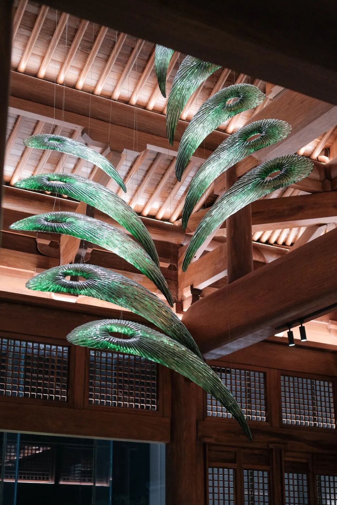 中央悬挂下一片片琉璃茶叶,又似从下方“茶碗”中溅起的水花。