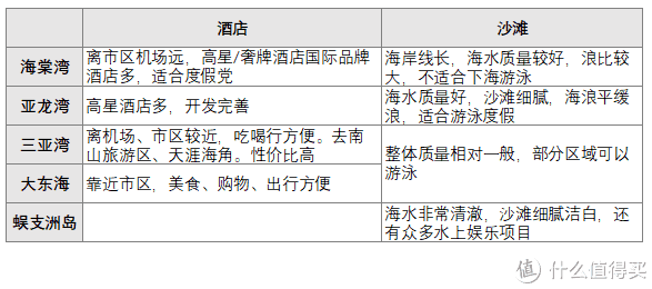1. 沙质、水质比三亚湾好,部分有私家沙滩;2. 吃住、去景点方便;3. 预算不高;4. 夜生活丰富;5. 有高星酒店