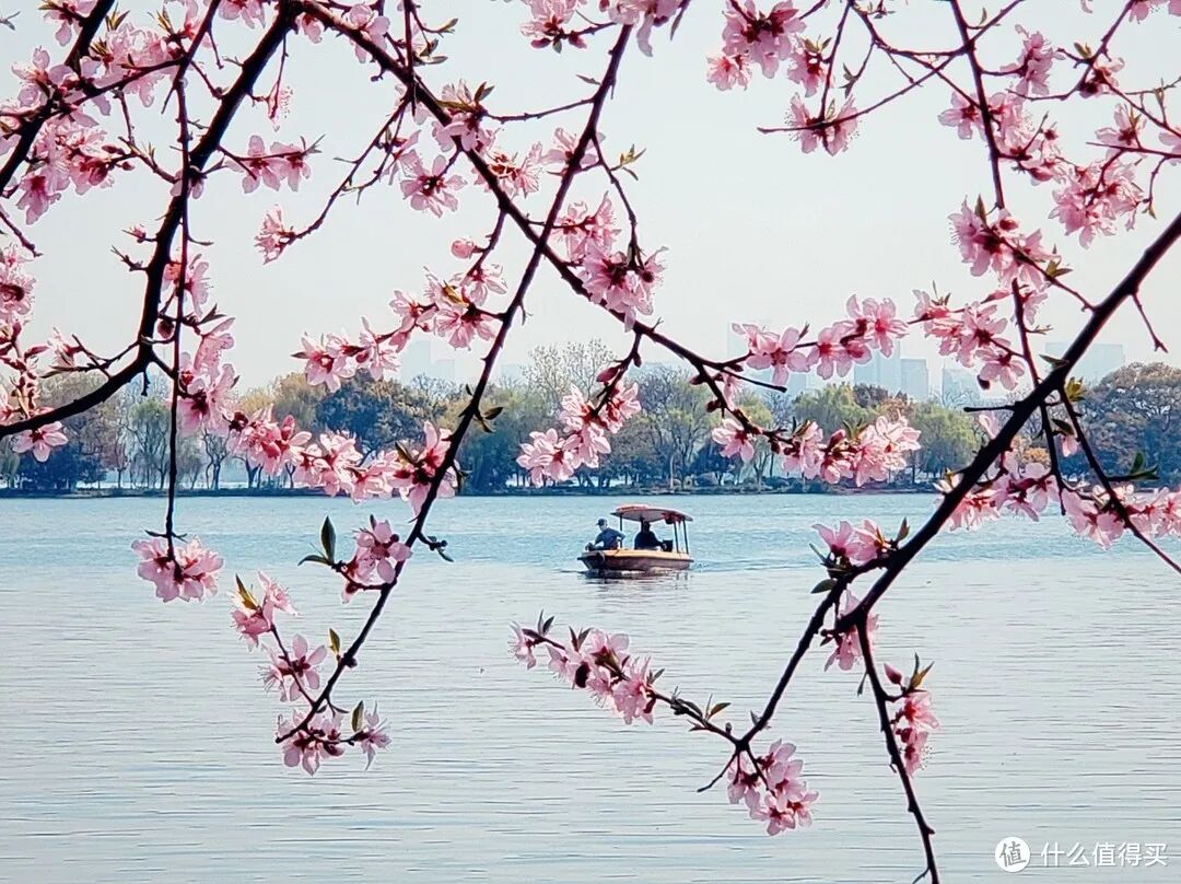 泛舟湖上,悠悠的湖水,衬着两岸桃红柳绿,令人赏心悦目,偶尔伴着绵绵春雨,烟雨朦胧中的桃色更显娇美。