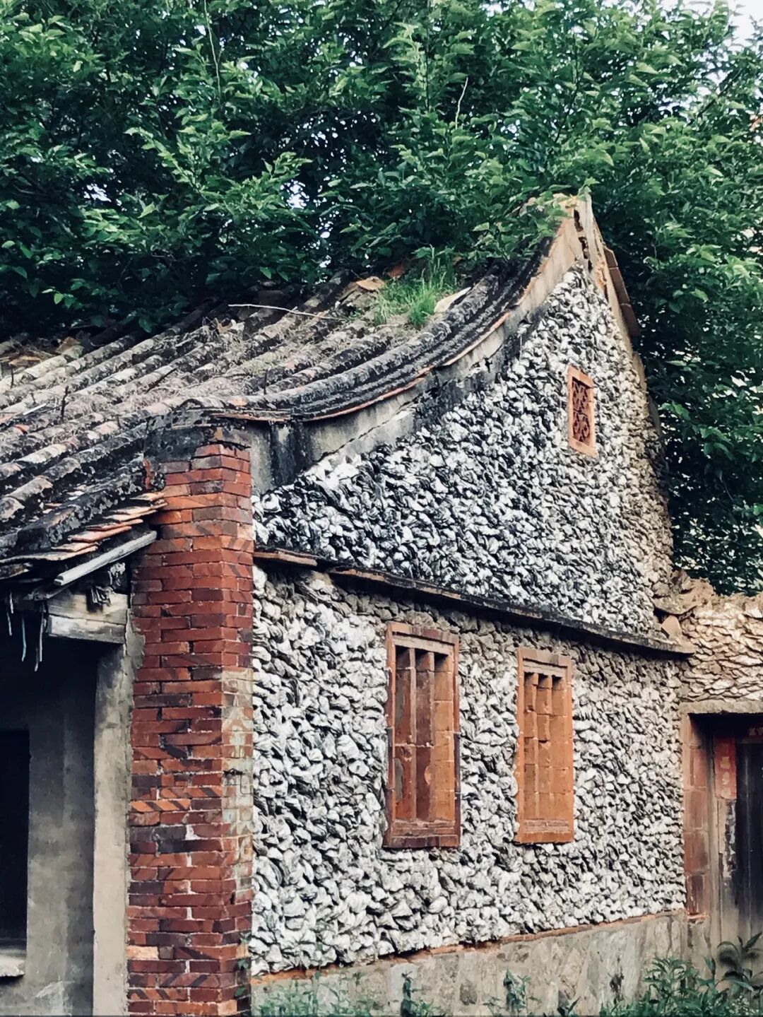 这里的建筑外墙,是层层叠得的牡蛎、生蚝壳堆成的,妥妥的“蚝宅”!爬山虎攀岩而上,非常有沿海特色。