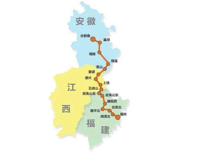 安徽段:安徽段途径合肥南、巢湖东、南陵、铜陵北、旌德、绩溪北、歙县北、黄山北等11个站,有古徽州文化旅游区、龙川景区、黄山、皖南古村落等多个5A级景区。