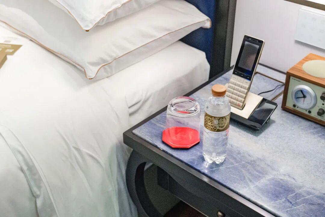 矿泉水和水杯被放置在床头、拖鞋也已经摆放好,甚至散乱的化妆品等也都铺好纸巾整理好~