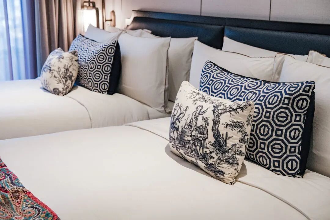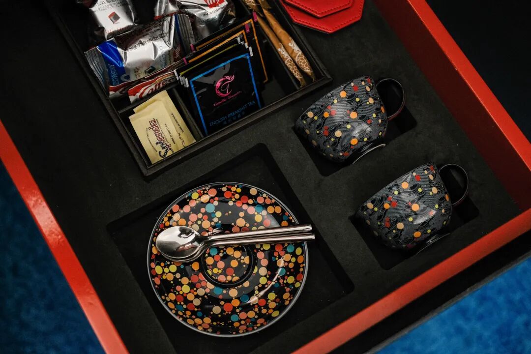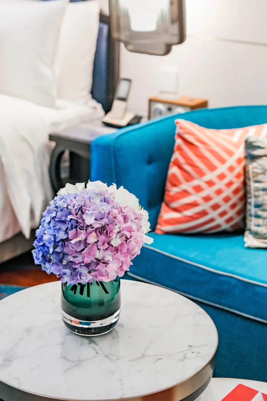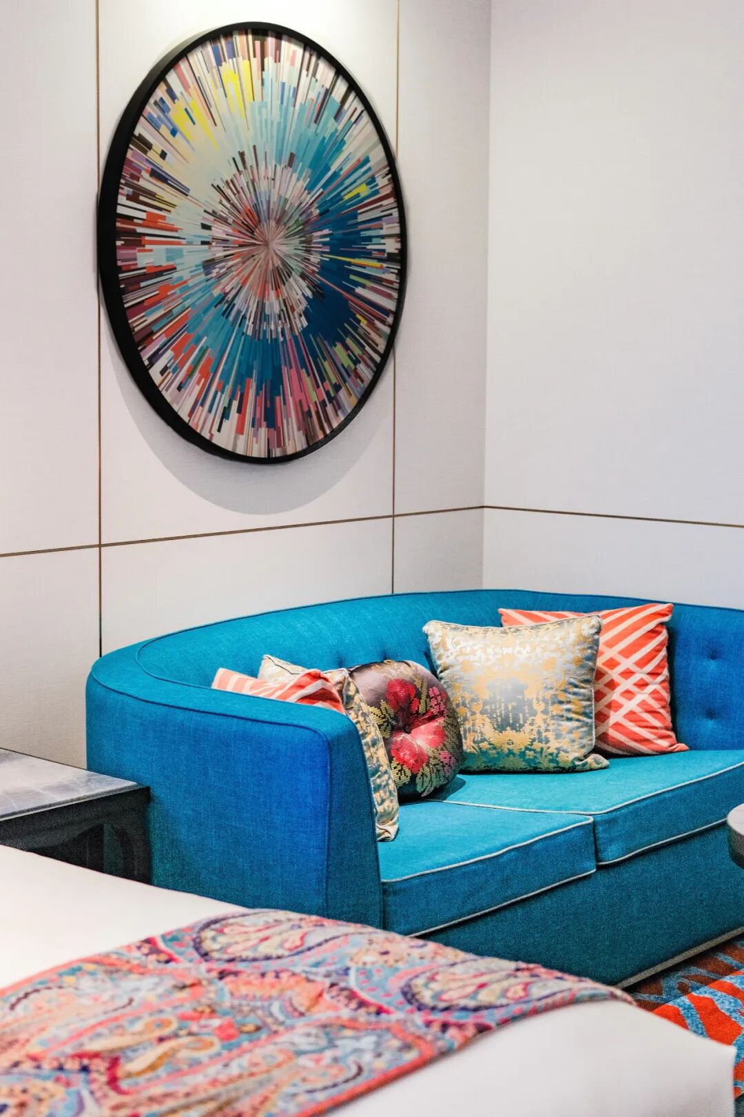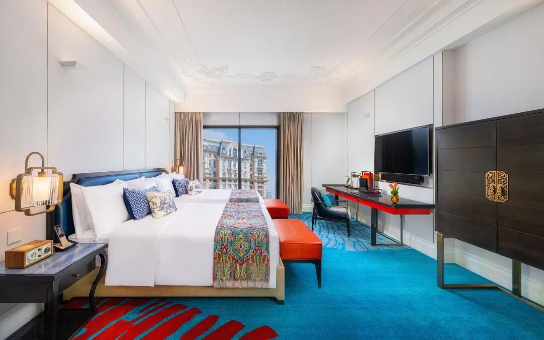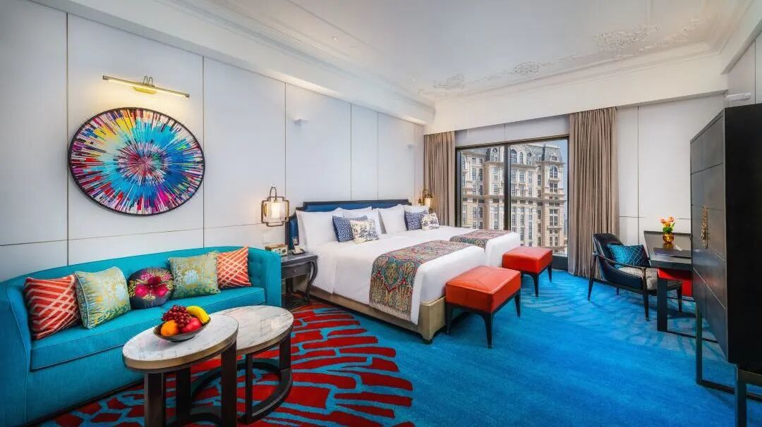 异域风情十足的蓝色为基调,加入各种红色、橙色等装饰,融合东西方元素,对比澳门酒店常见的“老钱风”,更多了些自由洒脱的时尚气息~
