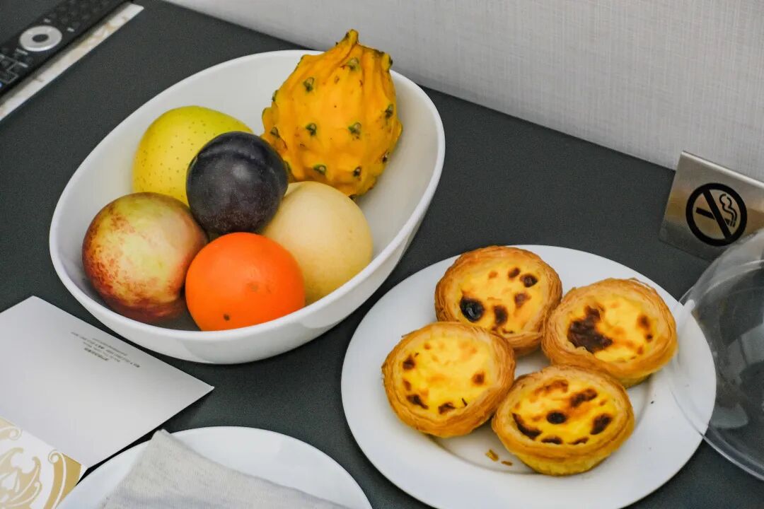 送上了欢迎水果和特色葡式蛋挞,水果盘大家也可以看一下,有燕窝果等等,分量十足!