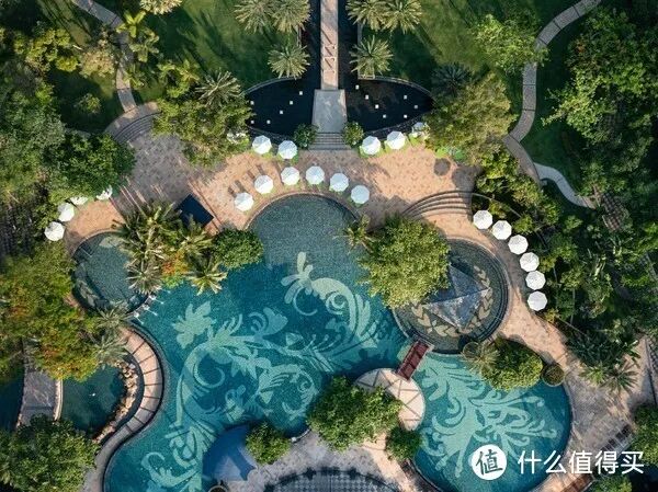 在海棠湾一线酒店里,这家的体量是比较小的,只有160间客房,但却拥有8000平户外草坪和9个室外泳池,公共空间很大,所以基本不会有拥挤的感觉,体验感更加好。