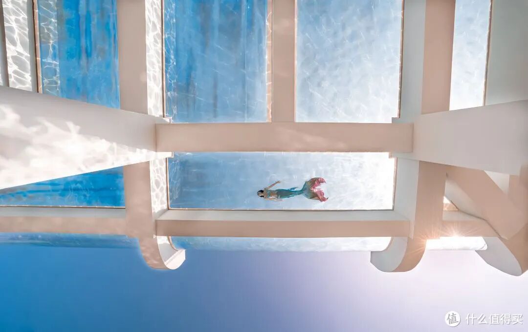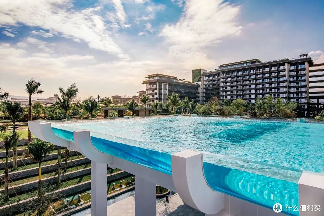 这家最标志性的打卡点,当属酒店C位的透明悬空玻璃泳池。长达55米,1100平米,还有美人鱼表演可以看~