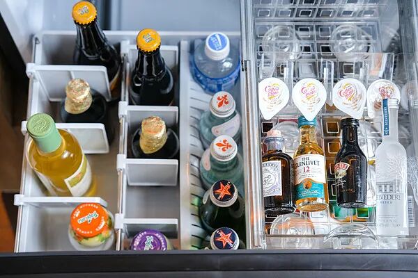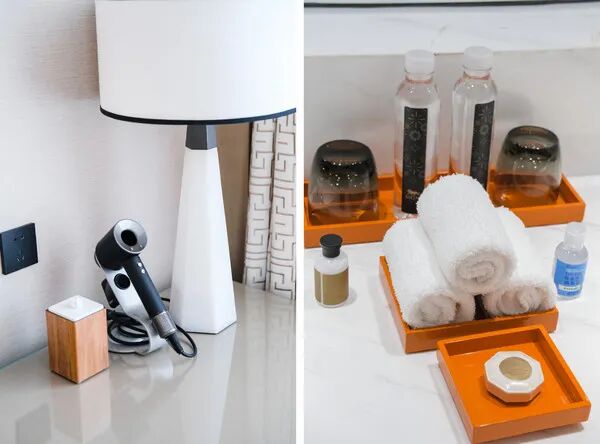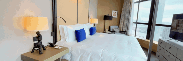 房间设计采用了美高梅标志性的蓝色与橙色,点缀了各种原木色的设计感家具,一贯的奢华却更多了属于这里的活力与艺术。