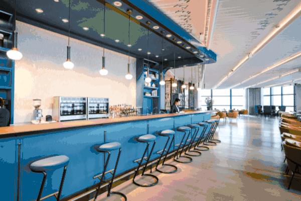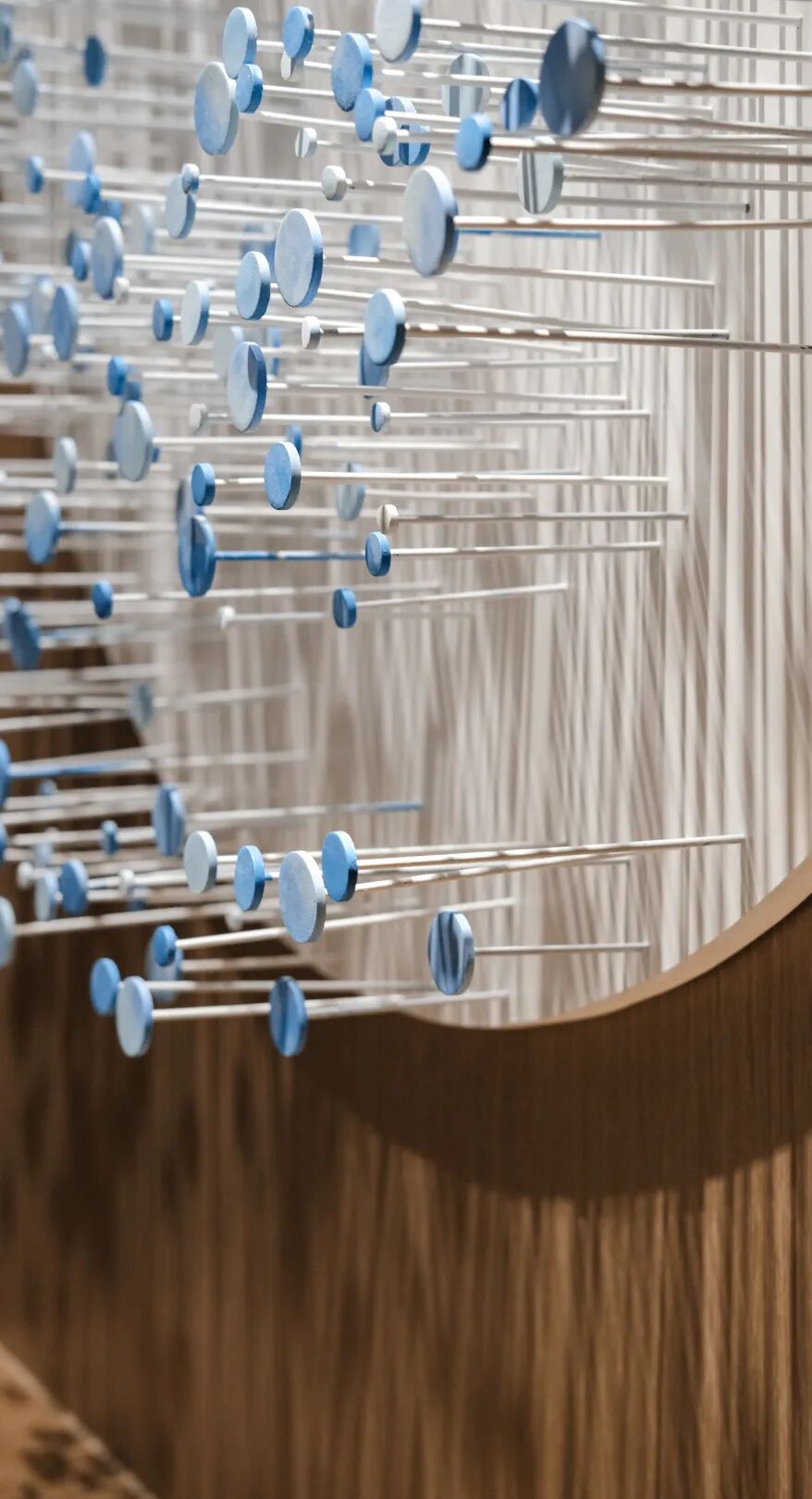 天青色的陶瓷瓶整齐排列,包括灯具等等都带有陶瓷元素,很有特色。在这里办完入住后,即可开启属于西岸美高梅的24H。