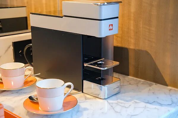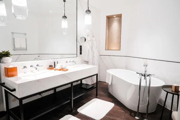 卫生间的备品是定制Lorenzo Villoresi,另外配有双水池、浴缸和淋浴,使用体验更加舒适。
