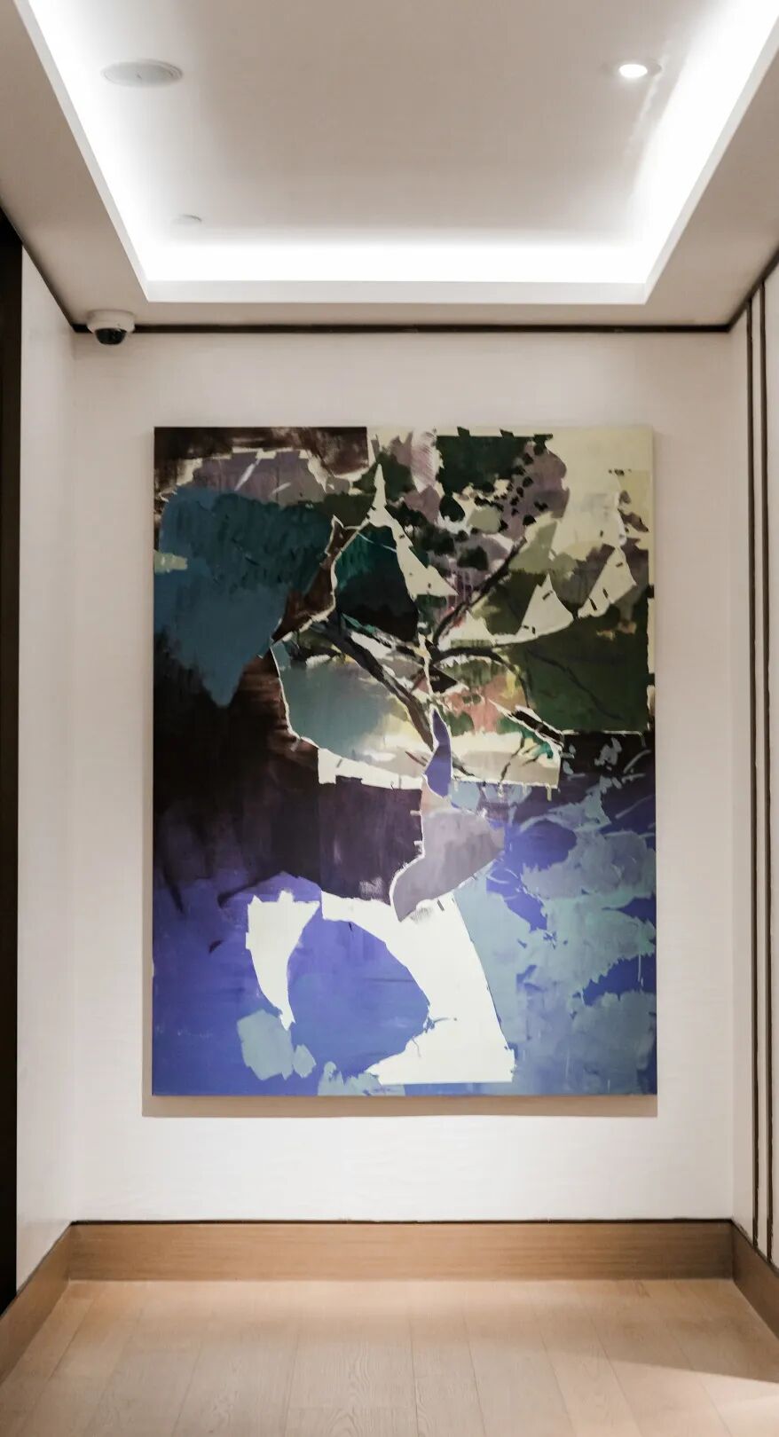 正中心的大型画作来自于艺术家丁乙,他的个人工作室也在西岸,这幅画作有他标志性的十字形元素,和周围的大理石搭配非常相得益彰。